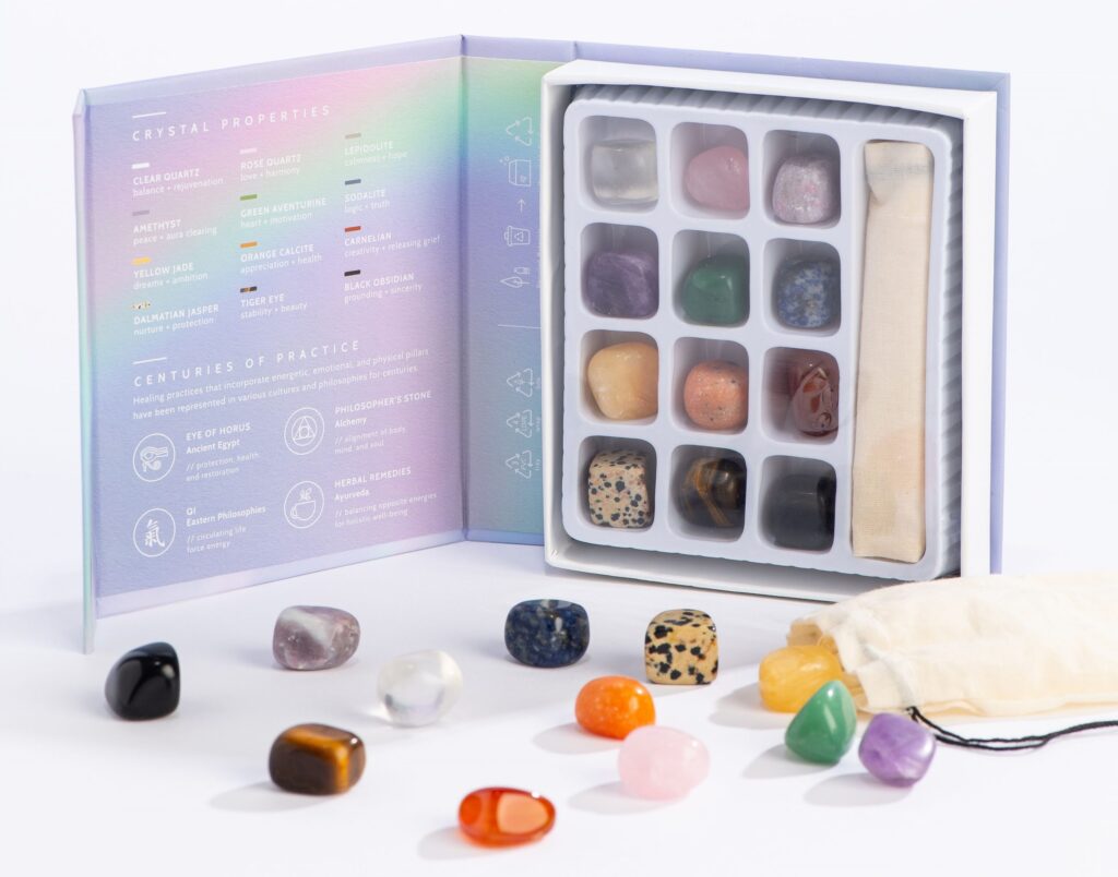 Healing Stones brings inspiring information about crystal properties and traditional healing practices together. Learn how to create a relaxing session with crystals from tips on the back of the box.