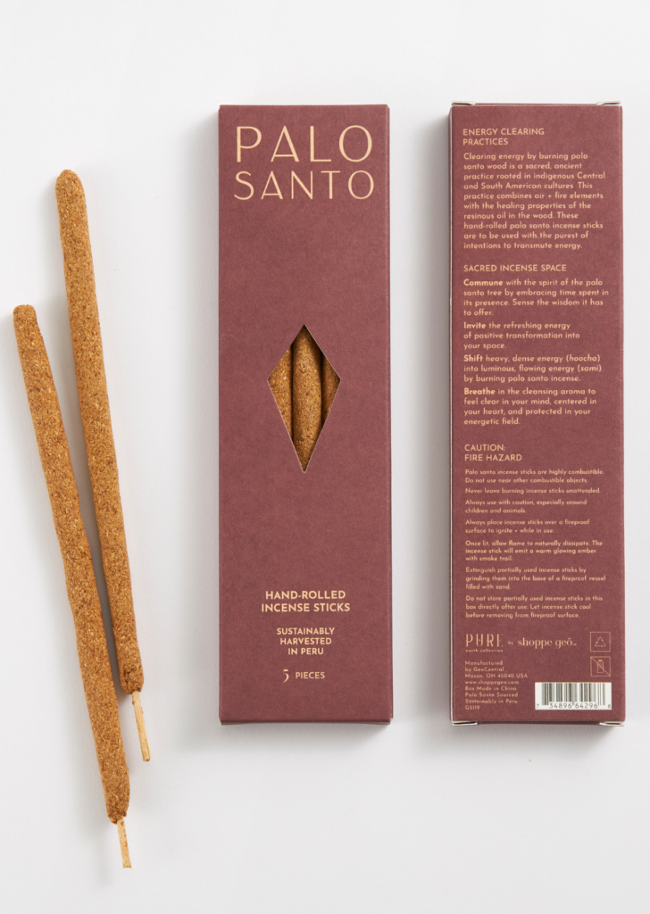 • Shoppe Geo’s Palo Santo Hand-Rolled Incense Sticks come in a set of 5 pieces and are sustainably harvested in Peru.
