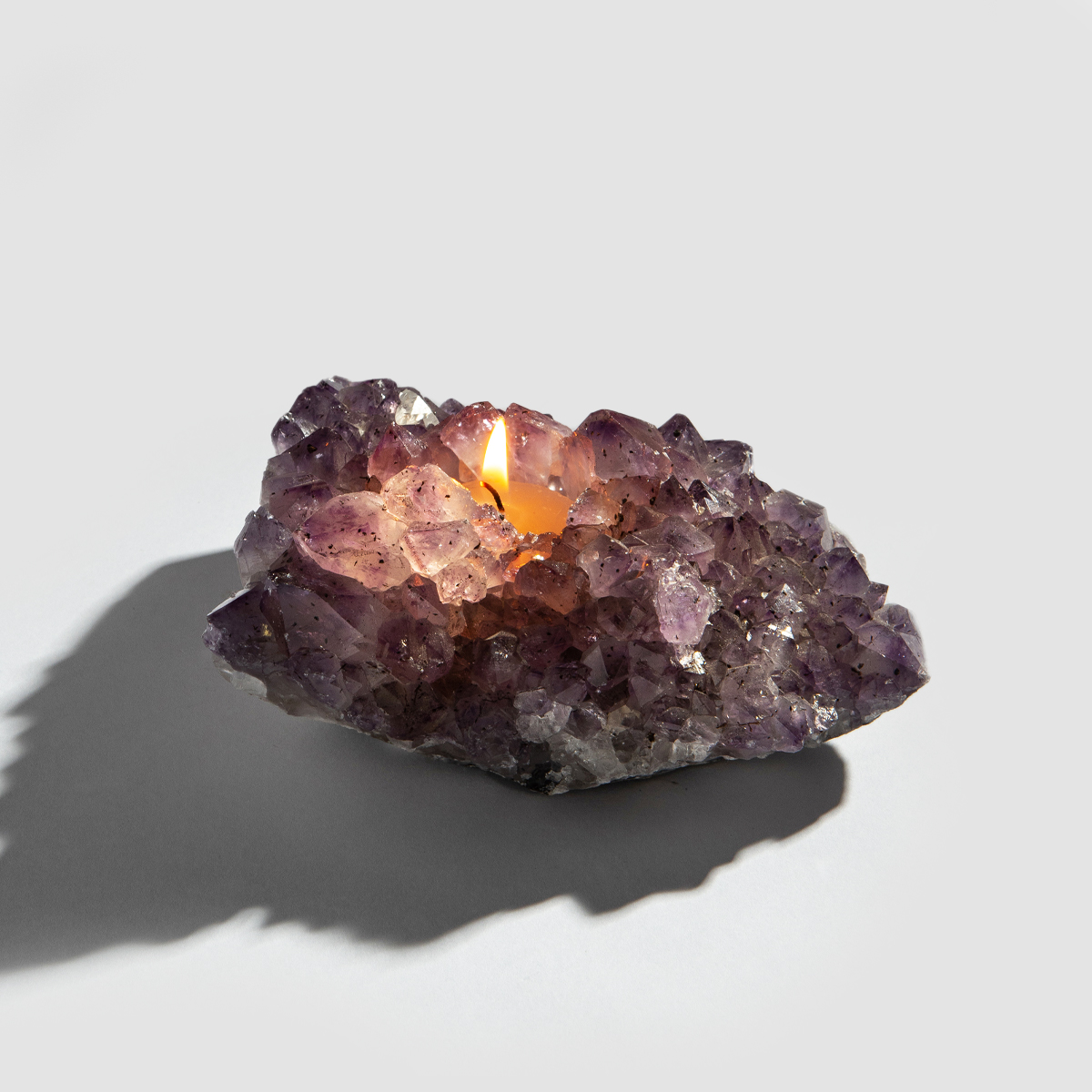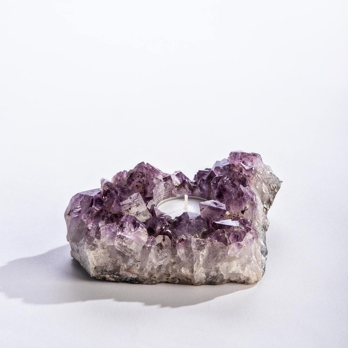 Our amethyst candle holder is the best way to make a statement and promote positive calming vibes. Amethyst has long been known to assist in clearing negativity and encouraging a calming atmosphere, making this the perfect accent piece to place in any space. Just add your favorite tea light candle and relax to its calming glow.