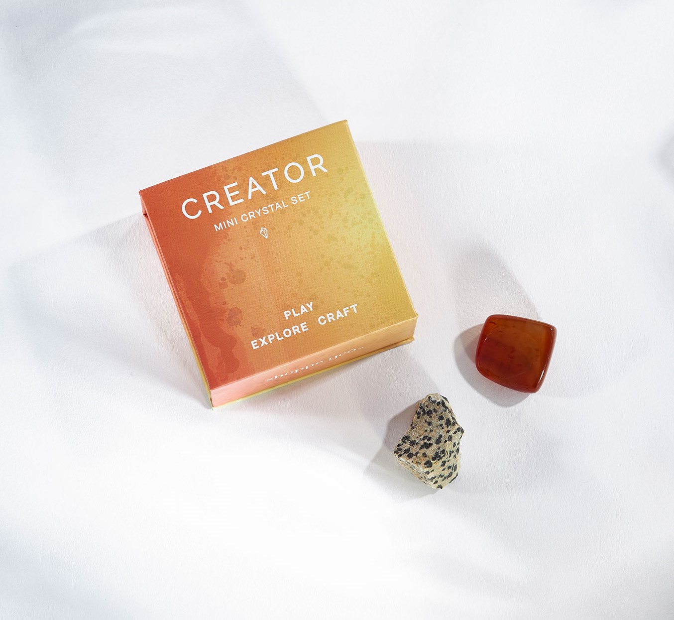 Back Cover: Dalmatian jasper and carnelian: for the creator whose creativity crafts beauty. These crystals have been curated to bring out the best and brightest qualities in any artistic spirit. Create the life you imagine!