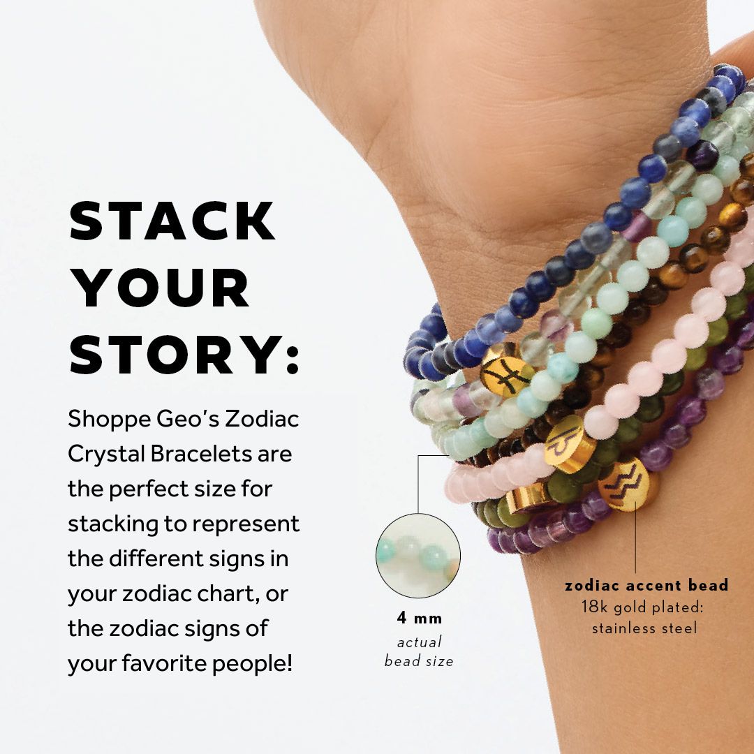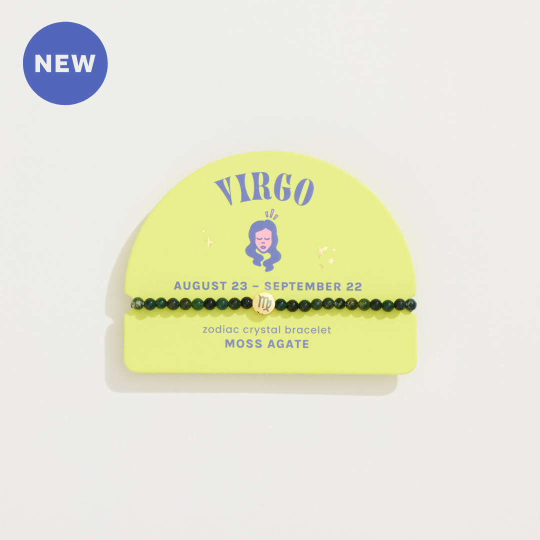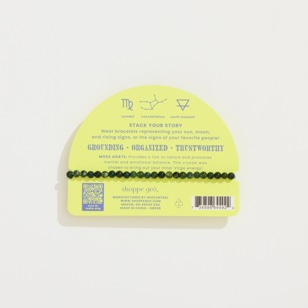 Boost your Virgo energy with moss agate! This crystal has been curated for the Virgo sign based on its metaphysical properties. Backer card features information about Virgo, the crystal, and a QR code linking to a Blogge Geo post about Zodiac 101! Mini Zodiac Bracelets with 4mm beads are perfect for stacking – Bracelet stacks can represent the main signs of your zodiac chart (sun, moon, and rising signs) or the zodiac signs of your favorite people! Pair with the matching Zodiac Crystal: Virgo for the perfect gift for your favorite Virgo, or yourself!
