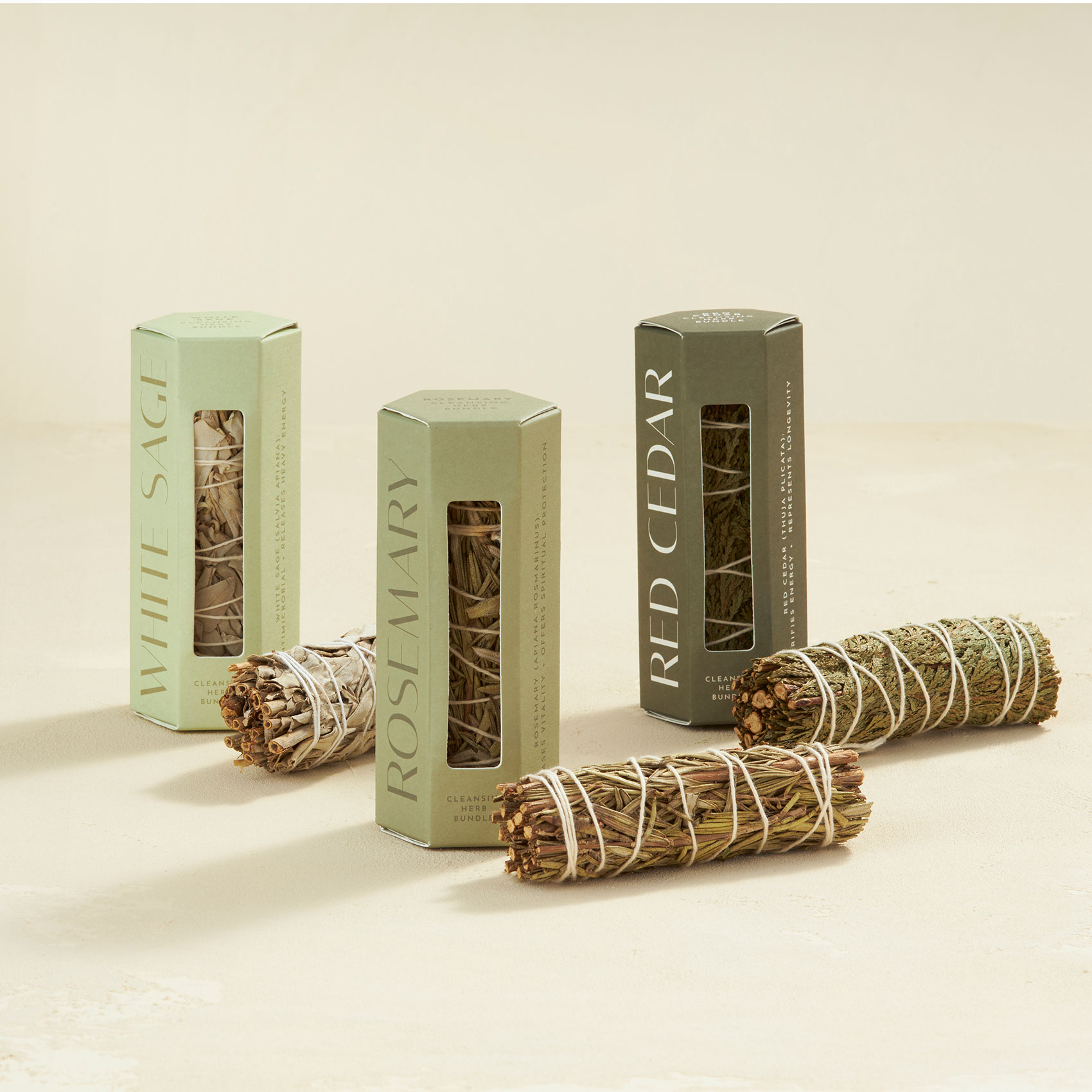Packaging: hexagon-style box, FSC certified ivory textured paper, soy-based ink, cut-out for viewing the herb bundle within, herb bundle secured with 100% cotton string