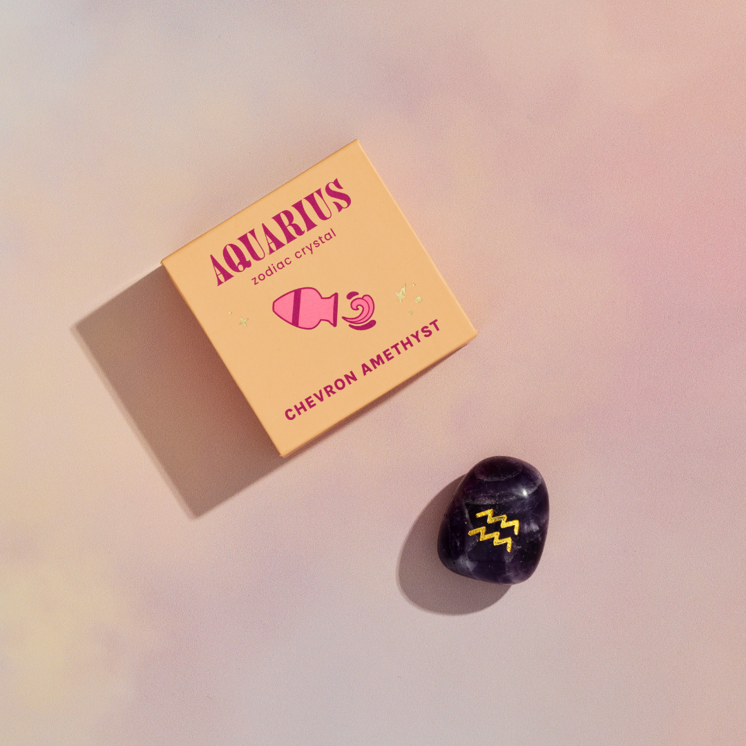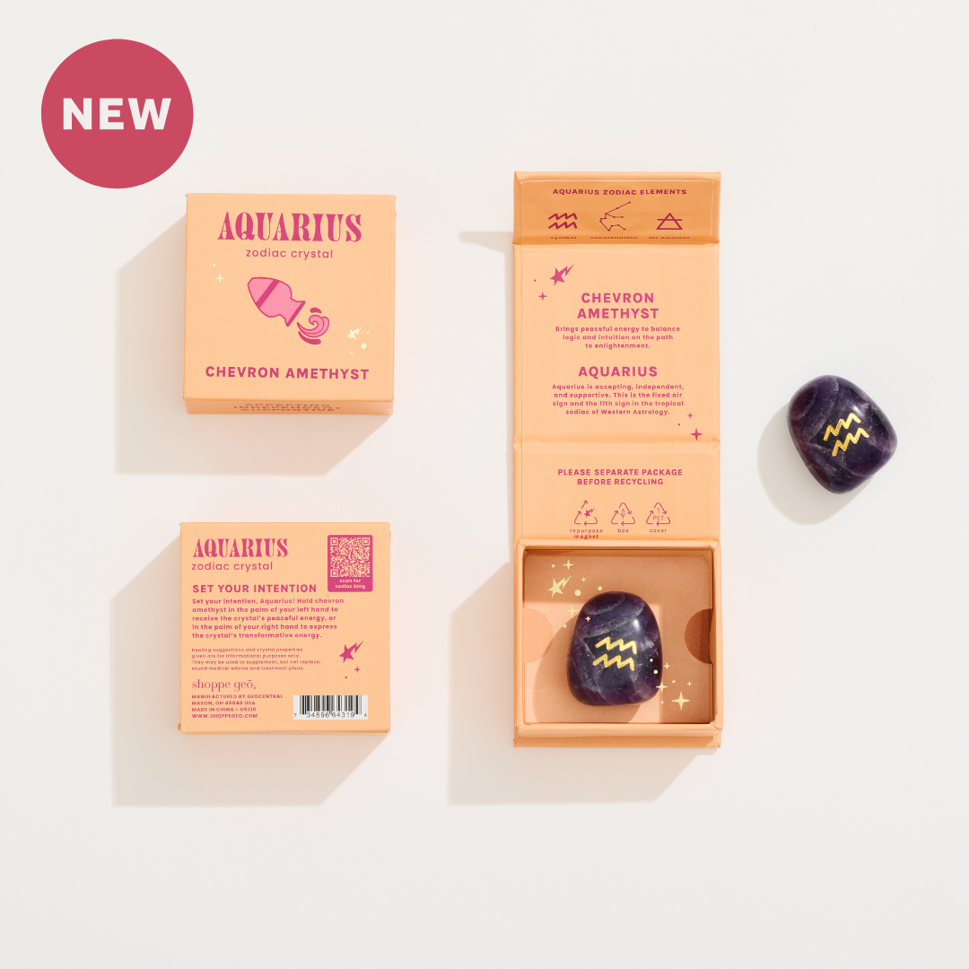 Boost your Aquarius energy with chevron amethyst! This crystal has been curated for the Aquarius sign based on its metaphysical properties. Box features information about Aquarius, the crystal, and a QR code linking to a Blogge Geo post about Zodiac 101! Pair with the matching Aquarius Mini Zodiac Bracelet for the perfect gift for your favorite Aquarius, or yourself!