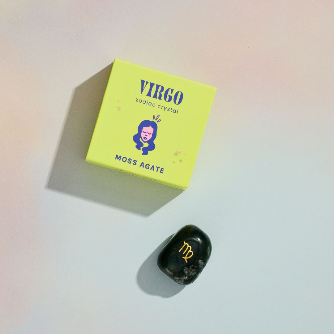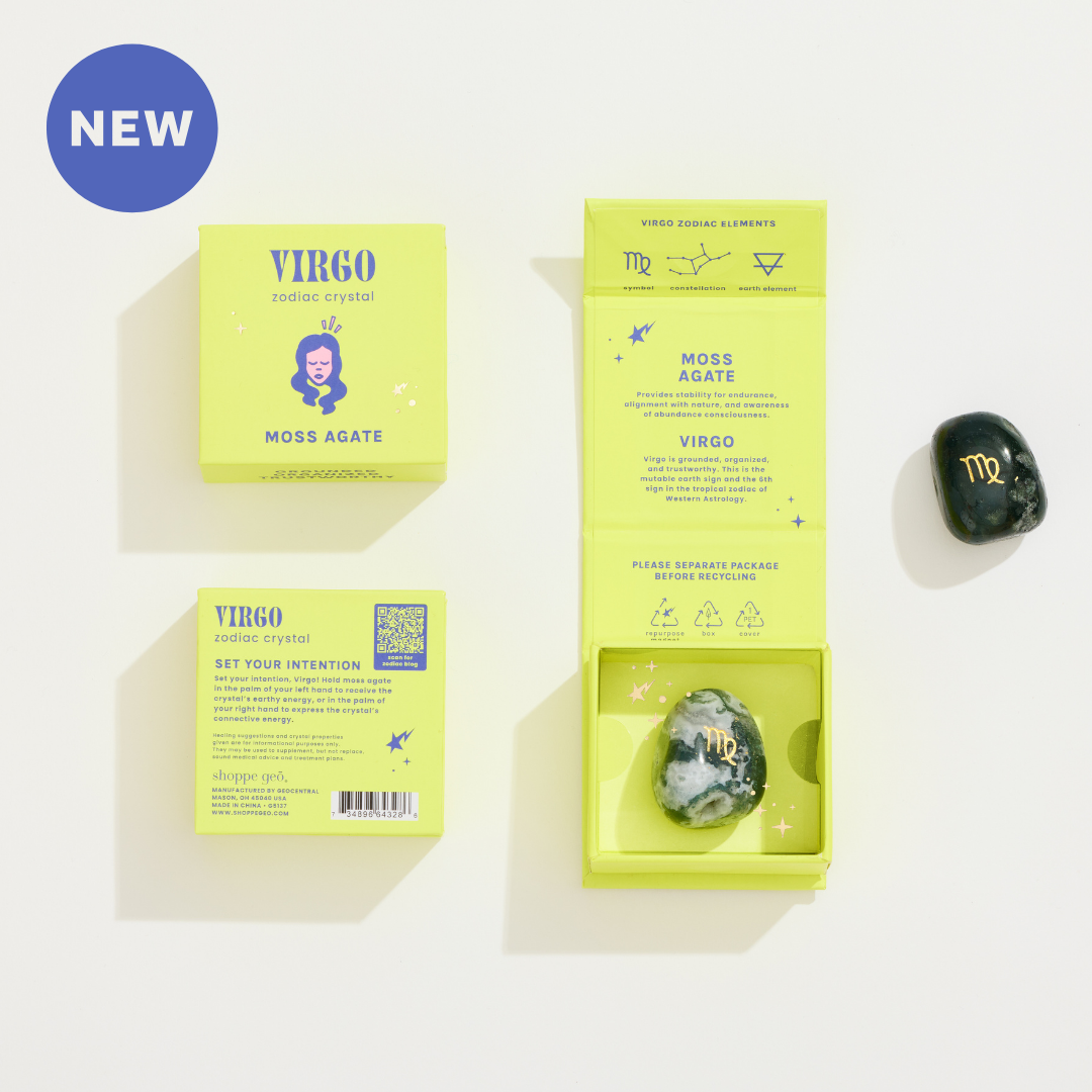 Boost your Aquarius energy with moss agate! This crystal has been curated for the Virgo sign based on its metaphysical properties. Box features information about Virgo, the crystal, and a QR code linking to a Blogge Geo post about Zodiac 101! Pair with the matching Virgo Mini Zodiac Bracelet for the perfect gift for your favorite Virgo, or yourself!