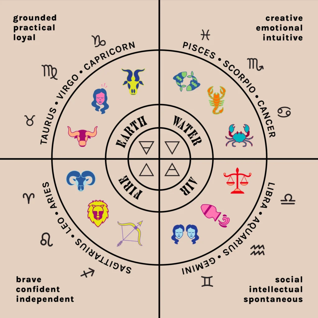 Each zodiac sign is associated with an element: Earth, Water, Air, or Fire. Each element corresponds with 3 zodiac signs and influences overarching personality traits of those signs.