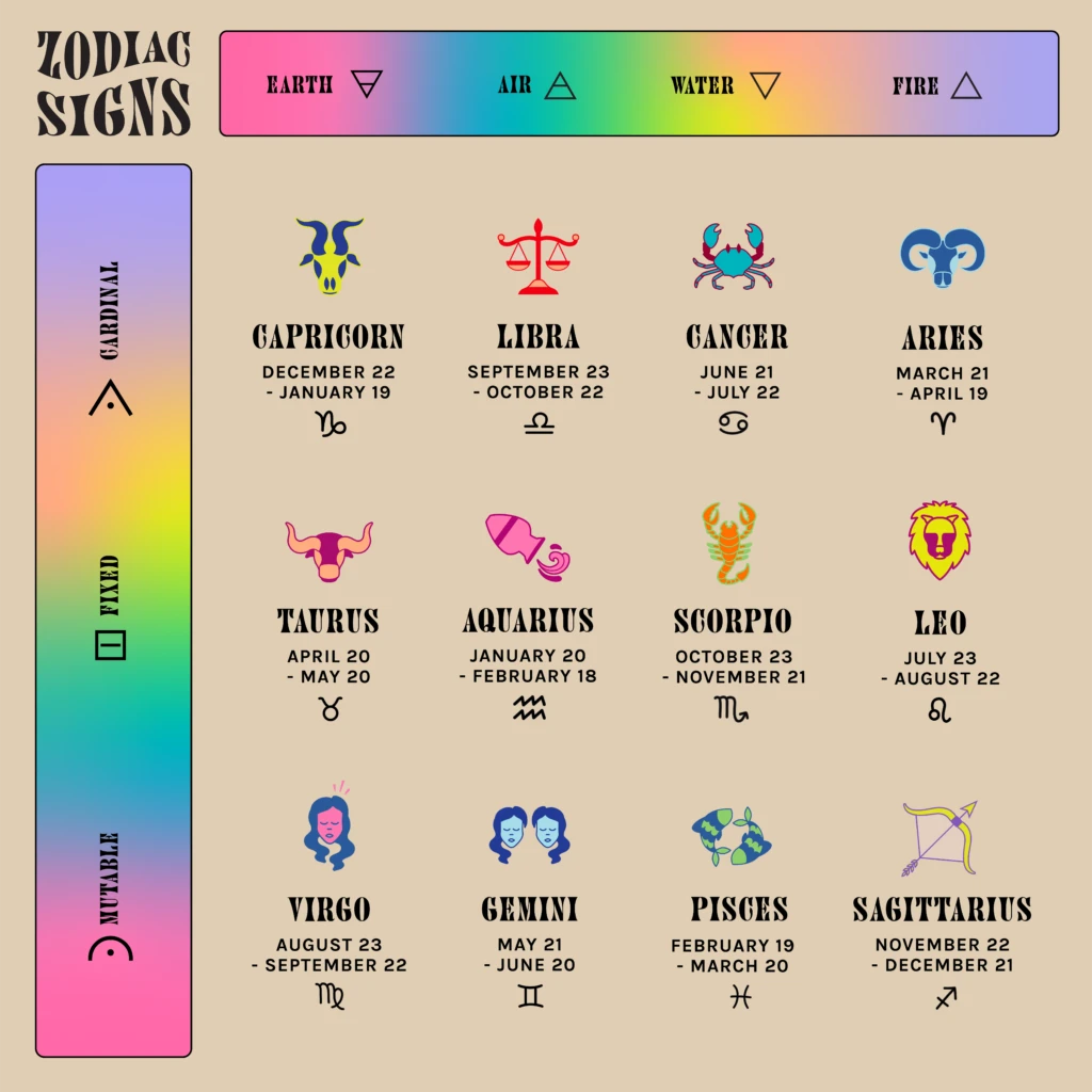 Each zodiac sign falls under one of three “modalities”: Cardinal, Fixed, or Mutable. These categories determine how each sign expresses their overarching energy.